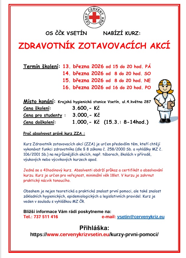 ZDRAVOTNÍK ZOTAVOVACÍCH AKCÍ se chystá na jaro 2026, přihláška níže, prosím odešlete na vsetin@cervenykriz.eu